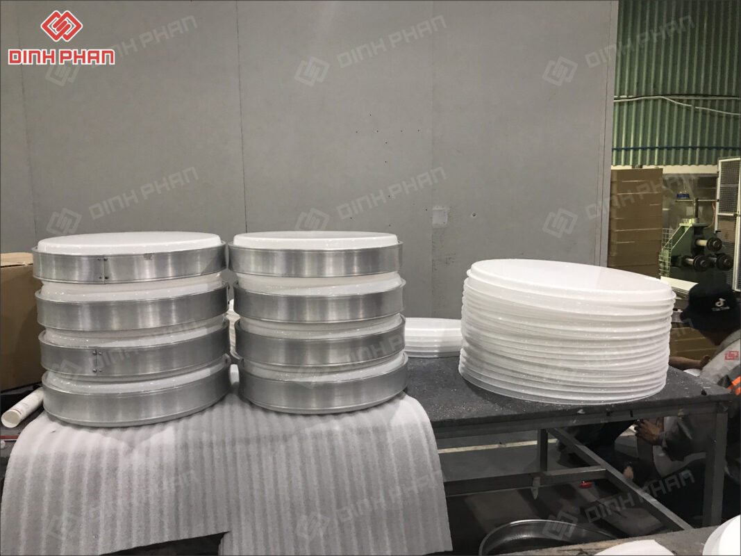 B5: Gắn bóng đèn led và nguồn đũa vào bên trong khung nhôm sao đó ráp mặt mica để hoàn thiện.